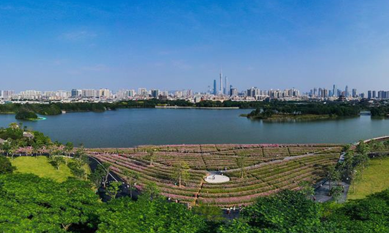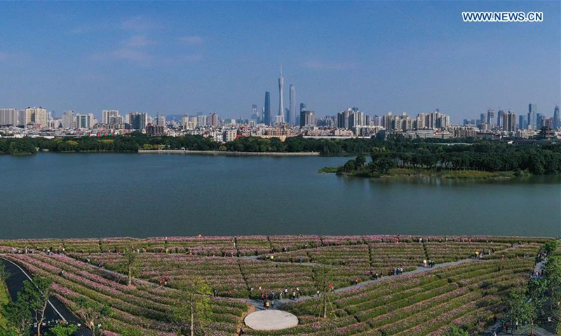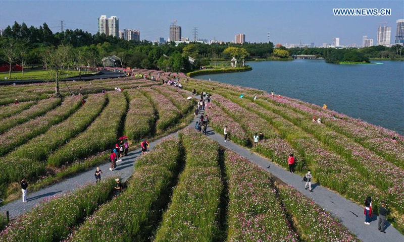 Aerial photo taken on Nov. 3, 2020 shows tourists viewing cosmos flowers at Haizhu Wetland Park in Guangzhou, capital of south China's Guangdong Province. (Xinhua/Liu Dawei)