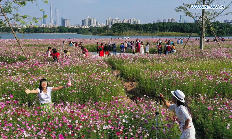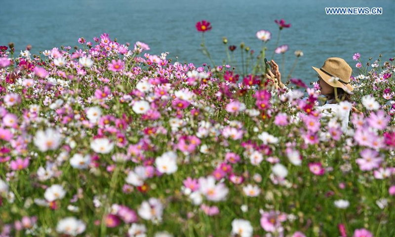 A tourist takes photos amid cosmos flowers at Haizhu Wetland Park in Guangzhou, capital of south China's Guangdong Province, Nov. 3, 2020. (Xinhua/Liu Dawei)