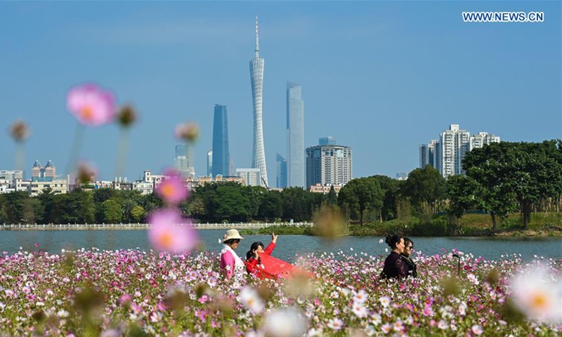 Tourists pose for photos amid cosmos flowers at Haizhu Wetland Park in Guangzhou, capital of south China's Guangdong Province, Nov. 3, 2020. (Xinhua/Liu Dawei)