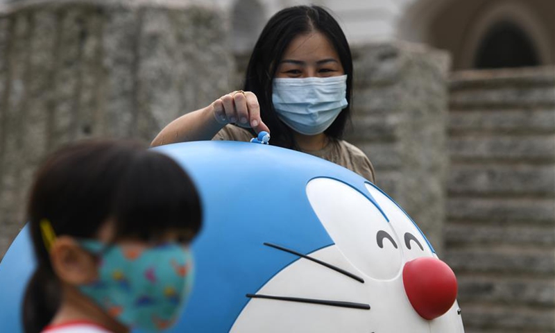 People visit the "Doraemon's Time-Travelling Adventures in Singapore" exhibition held at the National Museum of Singapore on Nov. 3, 2020. The exhibition will run till Dec. 27, 2020. (Photo by Then Chih Wey/Xinhua)