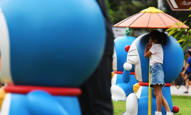 A girl visits "Doraemon's Time-Travelling Adventures in Singapore" exhibition held at the National Museum of Singapore on Nov. 3, 2020. The exhibition will run till Dec. 27, 2020. (Photo by Then Chih Wey/Xinhua)