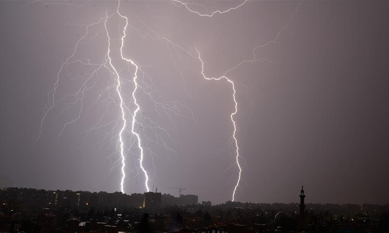 Lightning flashes during a thunderstorm in the capital Damascus, Syria, Nov. 9, 2020. (Photo by Ammar Safarjalani/Xinhua)