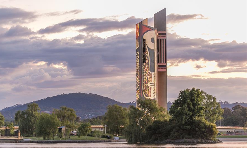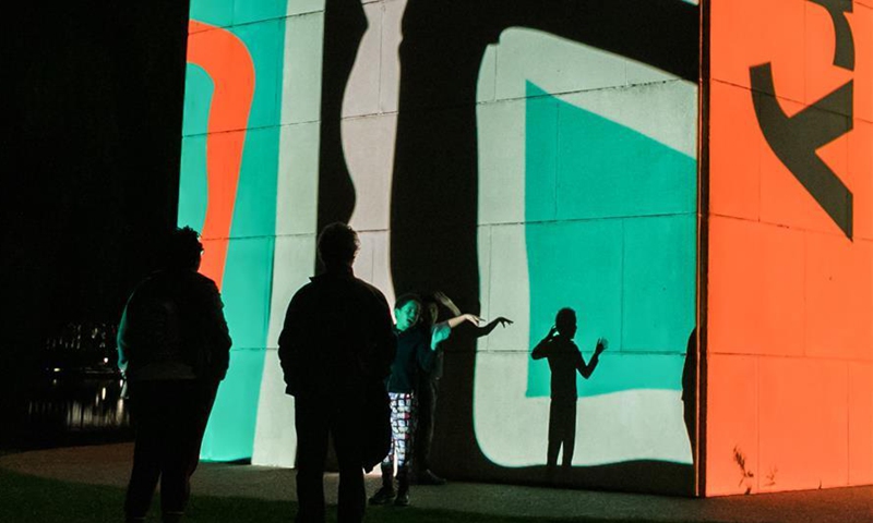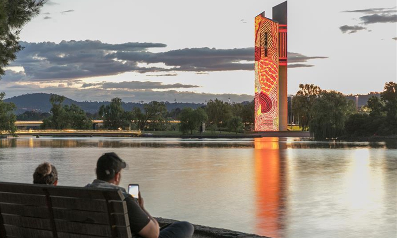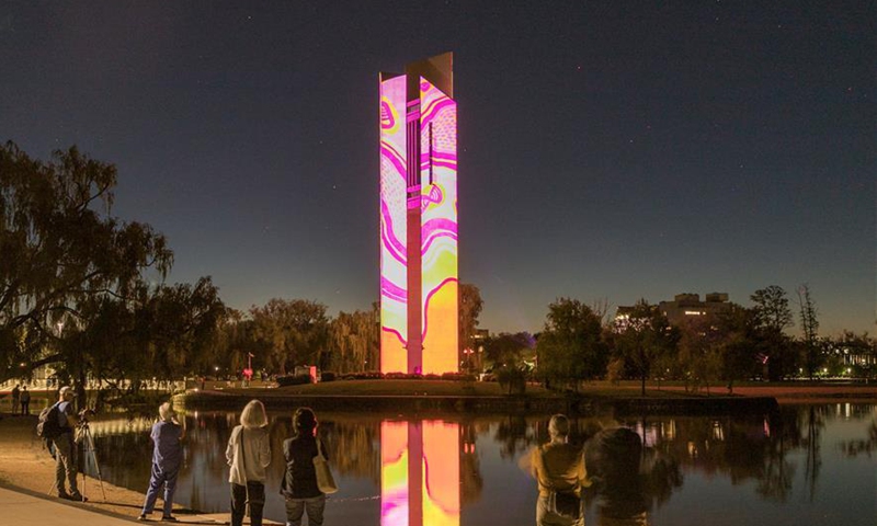 People watch the light projections on the National Carillon in Canberra, Australia, Nov. 10, 2020. The National Carillon is illuminated with a series of indigenous artworks and designs from Aboriginal and Torres Strait Islander artists from Nov. 8 to 15. (Photo by Liu Changchang/Xinhua)