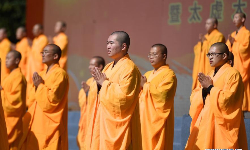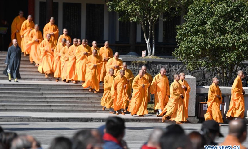 Monks attend a ritual during the Maitreya Cultural Festival of Xuedou Mountain in Ningbo, east China's Zhejiang Province, Nov. 11. 2020. (Xinhua/Huang Zongzhi)