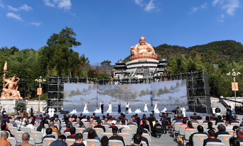 Photo taken on Nov. 11. 2020 shows the opening ceremony of the Maitreya Cultural Festival of Xuedou Mountain in Ningbo, east China's Zhejiang Province. (Xinhua/Huang Zongzhi)