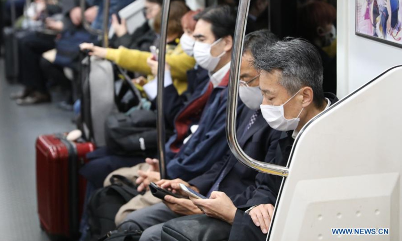 People wearing face masks sit in a train in Tokyo, Japan, on Nov. 12, 2020. Japan on Thursday confirmed a record 1,643 daily new COVID-19 infections owing to a resurgence of cases nationwide as the temperature continues to drop and more people stay indoors. The latest figure surpasses the previous nationwide record of 1,605 confirmed on Aug. 7. (Xinhua/Du Xiaoyi)