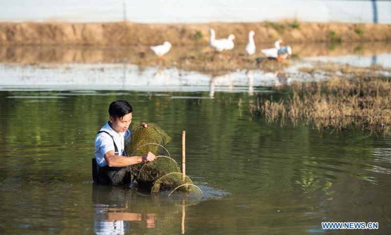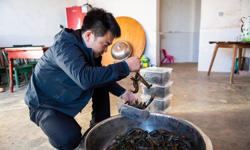 A breeder harvests Australian red claw crayfish at Jinpeng Village of Yonghe Town in Liuyang, central China's Hunan Province, Nov. 13, 2020. In recent years, the breeding of Australian red claw crayfish was introduced to Yonghe as an agricultural industry to help increase the incomes of local people.Photo:Xinhua