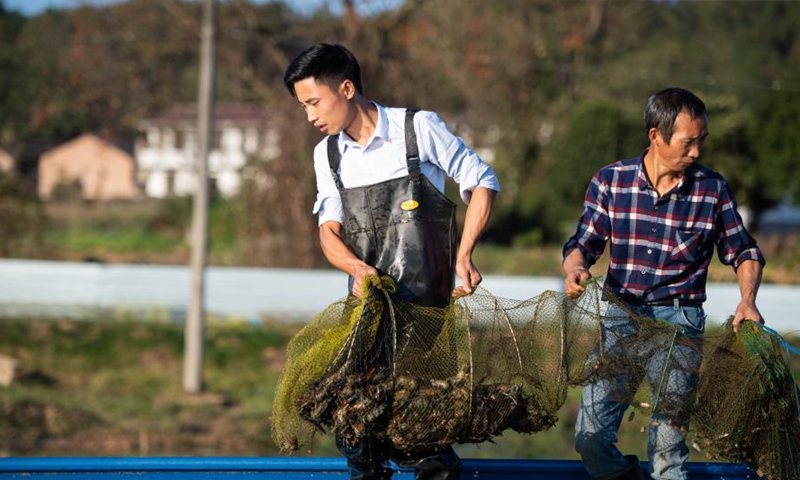 Breeders harvest Australian red claw crayfish at Jinpeng Village of Yonghe Town in Liuyang, central China's Hunan Province, Nov. 13, 2020. In recent years, the breeding of Australian red claw crayfish was introduced to Yonghe as an agricultural industry to help increase the incomes of local people.Photo:Xinhua
