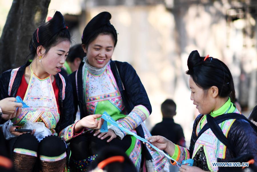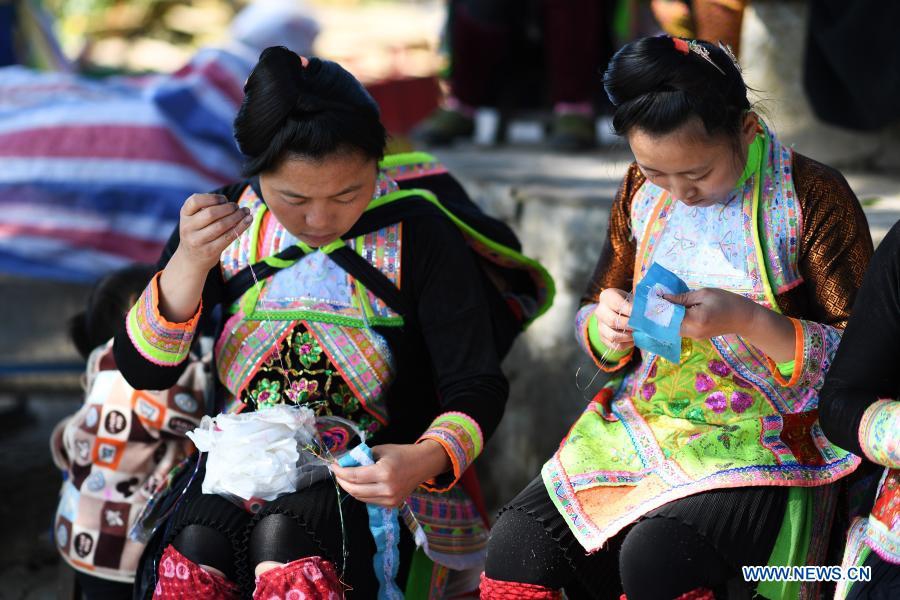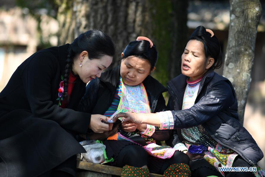 Women of the Miao ethnic group study embroidery at the workshop in Basha Village of the Miao ethnic group of Congjiang County, southwest China's Guizhou Province, Nov. 13, 2020. Training bases and workshops of embroidery and batik have been set up in Congjiang County with the assistance from Yunyan District of Guiyang City. So far, more than 1,700 local ethnic minority women learned the skills here and women from about 500 impoverished households have shaken off poverty in their home villages. (Xinhua/Yang Wenbin)