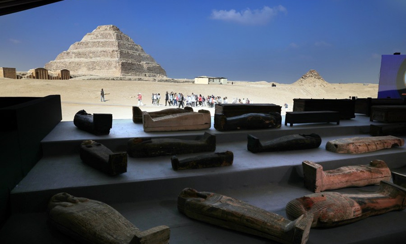Ancient coffins are seen on the site of the discovery, near the Step Pyramid of Djoser in Giza province, Egypt, on Nov. 14, 2020. (Photo: Xinhua)