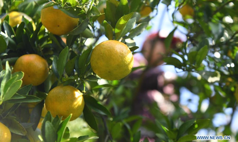 Villagers pick tangerines in Mingxi Village of Furong Town, Yongshun County, central China's Hunan Province, Nov. 14, 2020. In recent years, Furong Town in Yongshun County has taken advantages of its geographical conditions to develop the local tangerine planting industry, with the planting area of tangerine in the town reaching more than 7,000 mu (about 466.7 hectares) in 2019 and the yearly revenue reaching over 20 million yuan (3.03 million U.S. dollars). (Photo: Xinhua)