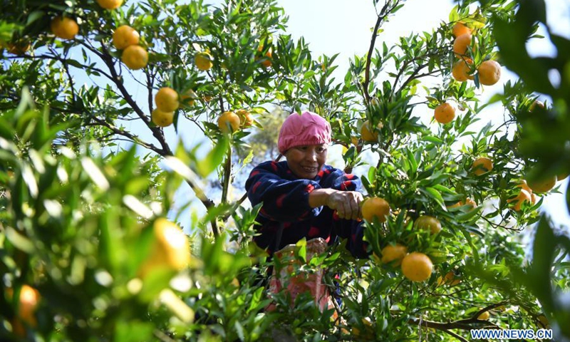 A villager picks tangerines in Mingxi Village of Furong Town, Yongshun County, central China's Hunan Province, Nov. 14, 2020. In recent years, Furong Town in Yongshun County has taken advantages of its geographical conditions to develop the local tangerine planting industry, with the planting area of tangerine in the town reaching more than 7,000 mu (about 466.7 hectares) in 2019 and the yearly revenue reaching over 20 million yuan (3.03 million U.S. dollars). (Photo: Xinhua)