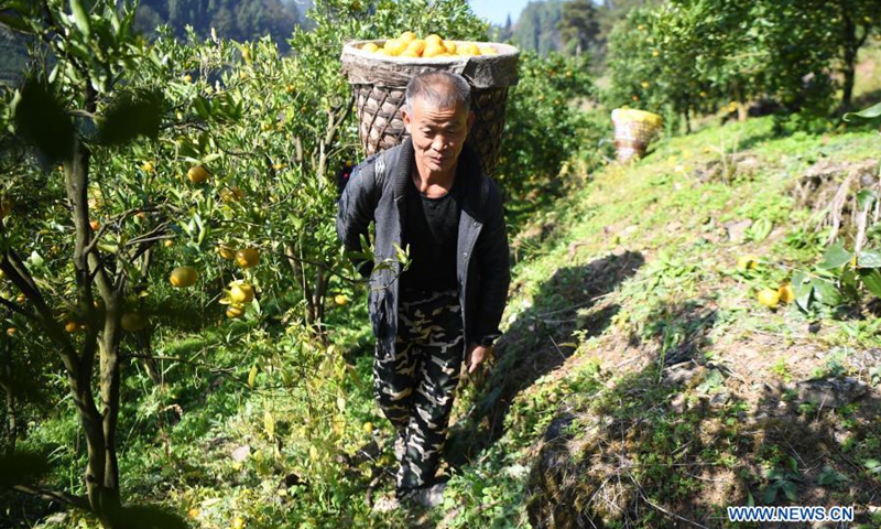 A villager transfers newly-picked tangerines on his back in Mingxi Village of Furong Town, Yongshun County, central China's Hunan Province, Nov. 14, 2020. In recent years, Furong Town in Yongshun County has taken advantages of its geographical conditions to develop the local tangerine planting industry, with the planting area of tangerine in the town reaching more than 7,000 mu (about 466.7 hectares) in 2019 and the yearly revenue reaching over 20 million yuan (3.03 million U.S. dollars). (Photo: Xinhua)