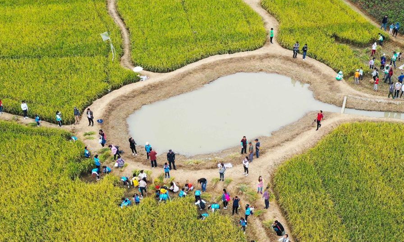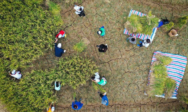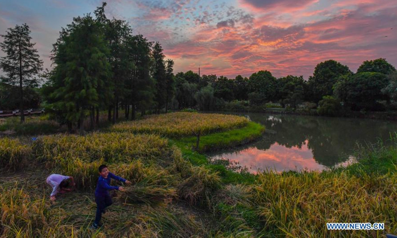 Aerial photo taken on Nov. 14, 2020 shows children harvesting rice with their parents at Haizhu Wetland in Guangzhou, capital city of south China's Guangdong Province. In recent years, the administration office of Haizhu Wetland Park has launched a series of family classes in its paddy fields, offering urban residents an opportunity to farming experience. (Xinhua/Liu Dawei)