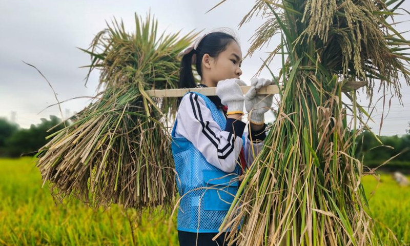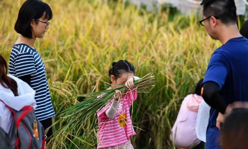 A child shoulders rice stalks at Haizhu Wetland in Guangzhou, capital city of south China's Guangdong Province, Nov. 14, 2020. In recent years, the administration office of Haizhu Wetland Park has launched a series of family classes in its paddy fields, offering urban residents an opportunity to farming experience. (Xinhua/Liu Dawei)