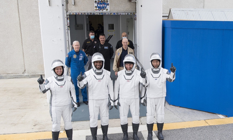 NASA astronauts Shannon Walker, left, Victor Glover, second from left, Mike Hopkins, second from right, and Japan Aerospace Exploration Agency (JAXA) astronaut Soichi Noguchi, right, wearing SpaceX spacesuits, stop to pose for a picture as walk out of the Neil A. Armstrong Operations and Checkout Building to depart for Launch Complex 39A during a dress rehearsal prior to the Crew-1 mission launch, on Nov. 12, 2020, at NASA's Kennedy Space Center in Florida. Photo: VCG