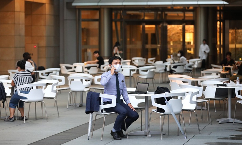 A man wearing a face mask talks through a cellphone in Tokyo, Japan, on Sept. 2, 2020. (Xinhua/Du Xiaoyi)