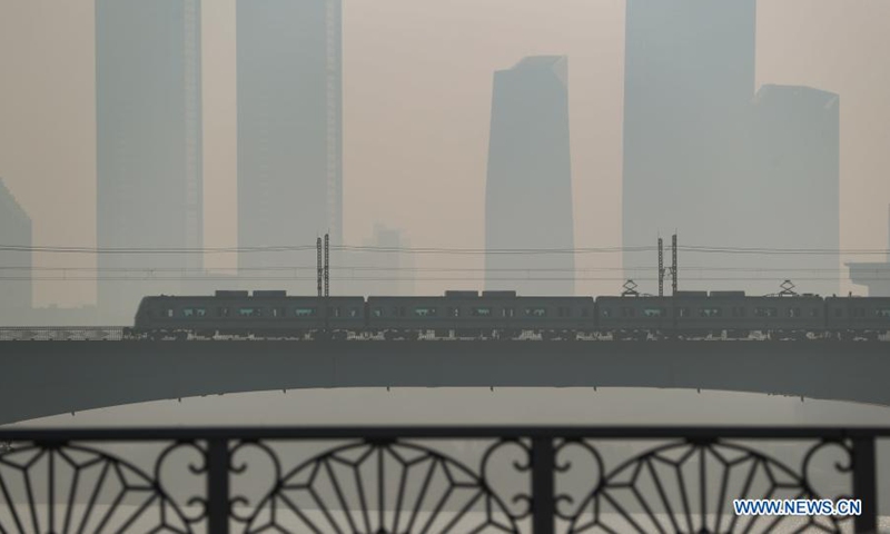 A train crosses a bridge over the Hangang River shrouded in smog in Seoul, South Korea, Nov. 16, 2020. Thick haze engulfed South Korea's capital city Seoul as well as its surrounding areas on Monday. (Xinhua/Wang Jingqiang)