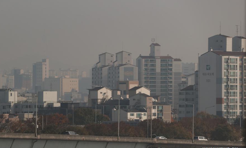 Buildings are shrouded in smog in Seoul, South Korea, Nov. 16, 2020. Thick haze engulfed South Korea's capital city Seoul as well as its surrounding areas on Monday. (Xinhua/Wang Jingqiang)
