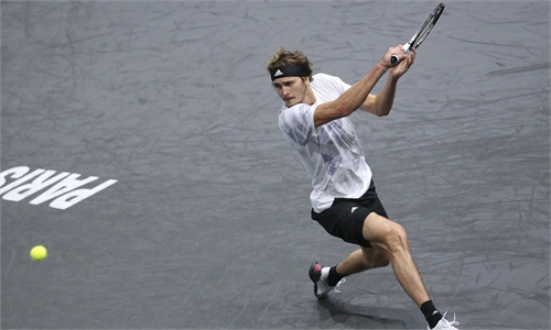 Rafael Nadal hits a backhand during his round-robin match against Andrey Rublev at the ATP World Tour Finals on Sunday in London, England. Photo: VCG