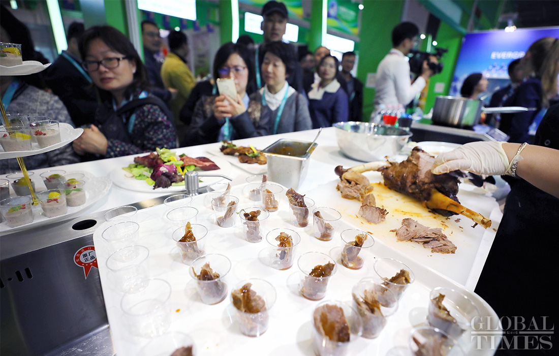A chef from a Michelin star restaurant prepares food to share with visitors at the exhibition area for Food & Agricultural Products during CIIE 2018 in Shanghai. Photo: Yang Hui/GT