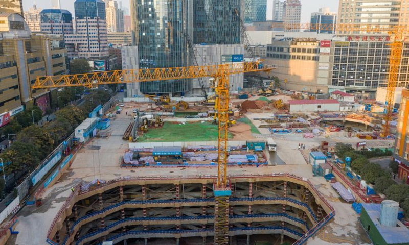 Aerial photo taken on Nov. 17, 2020 shows a general view of the Jinling Zhonghuan construction project in Nanjing, east China's Jiangsu Province. Constructors of the Jinling Zhonghuan construction project have recently adopted a "smart worksite" application system that integrates computing technologies and the Internet of Things to ensure worksite safety, and to enhance managerial efficiency. The system comprises a digital project platform, a face recognition system, a personal location system, and an environmental monitoring system. (Xinhua/Li Bo)