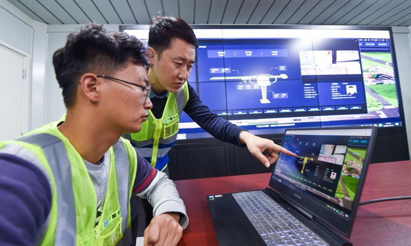 Engineers of the First Company of the China Construction Third Engineering Bureau supervise a worksite over a digital project platform in Nanjing, east China's Jiangsu Province, Nov. 17, 2020. Constructors of the Jinling Zhonghuan construction project have recently adopted a "smart worksite" application system that integrates computing technologies and the Internet of Things to ensure worksite safety, and to enhance managerial efficiency. The system comprises a digital project platform, a face recognition system, a personal location system, and an environmental monitoring system. (Xinhua/Li Bo)