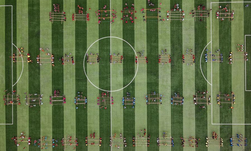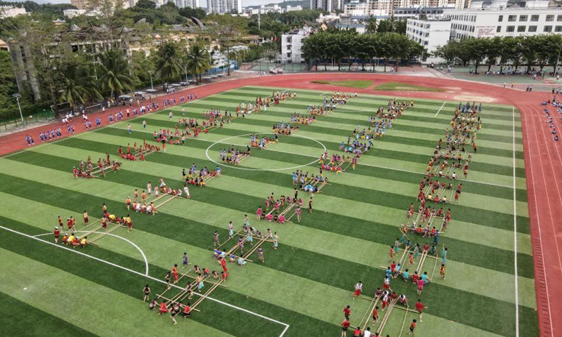 Aerial photo taken on Nov. 18, 2020 shows students participating in a bamboo dance competition at Baoting Middle School in Baoting Li and Miao Autonomous County, south China's Hainan Province. As a part of the art festival of Baoting Middle School, a bamboo dance competition was held here on Wednesday. Since 2003, several schools in Baoting have introduced bamboo dance to the campus so as to inherit the traditional national culture. (Xinhua/Zhang Liyun)