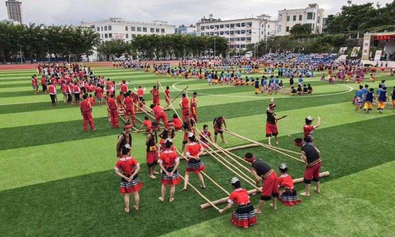Students participate in a bamboo dance competition at Baoting Middle School in Baoting Li and Miao Autonomous County, south China's Hainan Province, Nov. 18, 2020. As a part of the art festival of Baoting Middle School, a bamboo dance competition was held here on Wednesday. Since 2003, several schools in Baoting have introduced bamboo dance to the campus so as to inherit the traditional national culture. (Xinhua/Zhang Liyun)