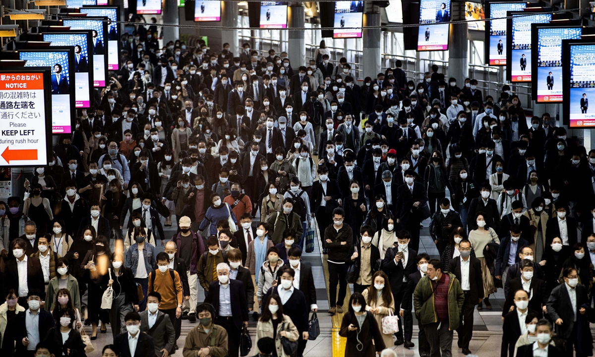 Commuters wearing face masks walk at Shinagawa Station in Tokyo, Japan on Thursday. Japan is on "maximum alert" after logging a record number of daily coronavirus infections, Prime Minister Yoshihide Suga said, though no immediate restrictions are planned. The country recorded more than 2,000 coronavirus cases in a single day for the first time on Wednesday. Photo: AFP