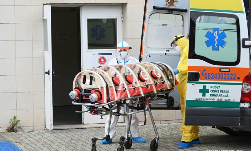 Medial staff prepare biocontainment stretcher to transfer COVID-19 patients at the San Filippo Neri Hospital in Rome, Italy, Nov 2, 2020. Italian Prime Minister Giuseppe Conte on Monday announced stricter measures to contain the spread of the novel coronavirus, as 22,253 new infections were reported, bringing the tally to 731,588 in the country.Photo:Xinhua