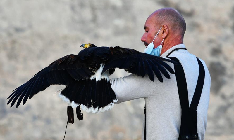 A falconer and his harris hawk participate in the falconry demonstration in Wied iz-Zurrieq, Malta, Nov. 22, 2020. The event is held to mark the World Falconry Day originated by the International Association for Falconry and the Conservation of Birds of Prey. (Photo by Jonathan Borg/Xinhua)