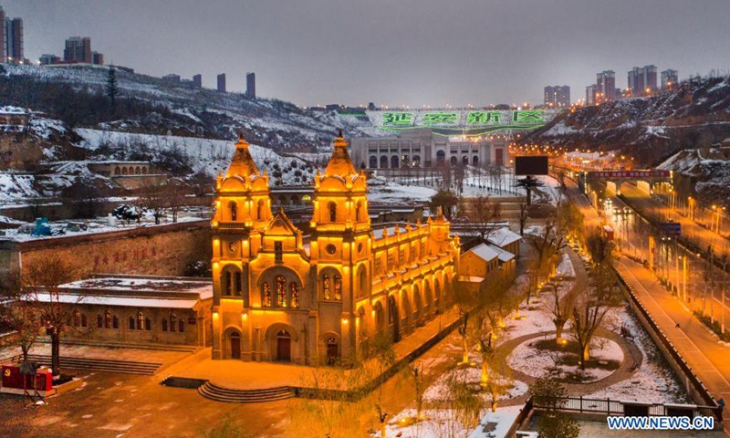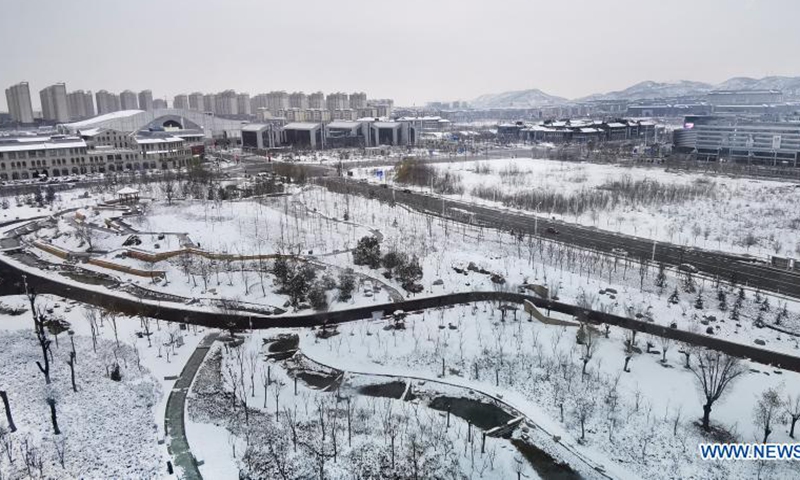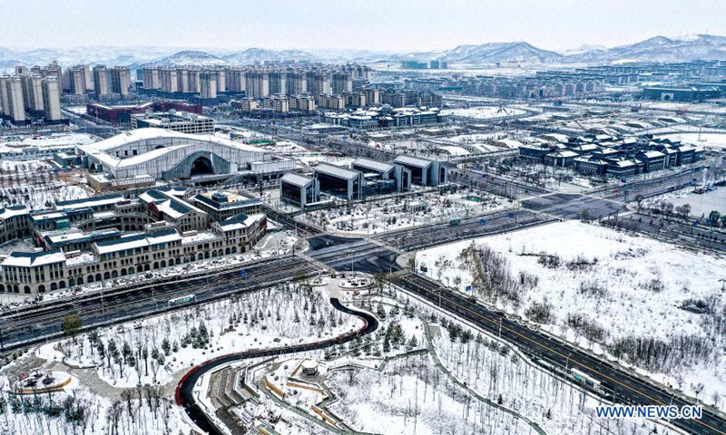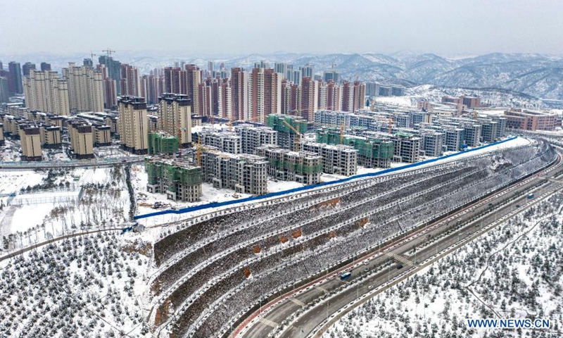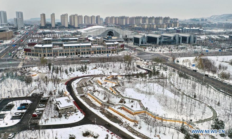 Aerial photo taken on Nov. 23, 2020 shows the snow covered Yan'an City, northwest China's Shaanxi Province. (Xinhua/Tao Ming)