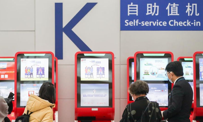 Passengers perform self-service check-in process at Terminal 2 building of the Shanghai Pudong International Airport in east China's Shanghai, Nov. 24, 2020. The airport's recent daily throughput maintains at around 1,000 flights, with passengers wearing face masks and orderly moving in and out. (Xinhua/Ding Ting)