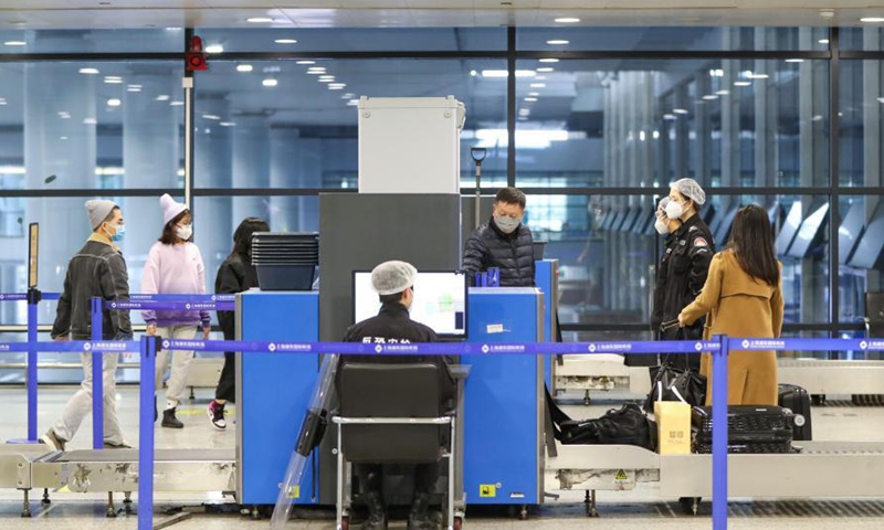 Passengers pass security checkpoint at Terminal 2 building of the Shanghai Pudong International Airport in east China's Shanghai, Nov. 24, 2020. The airport's recent daily throughput maintains at around 1,000 flights, with passengers wearing face masks and orderly moving in and out. (Xinhua/Ding Ting)