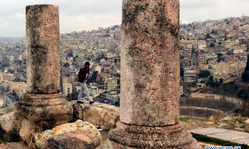 A tourist visits the Citadel archaeological site in Amman, capital of Jordan, Nov. 26, 2020. (Photo by Mohammad Abu Ghosh/Xinhua)