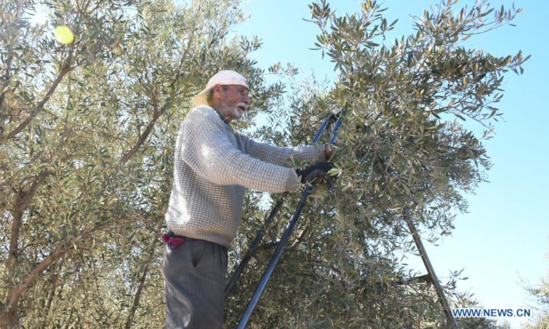 A farmer harvests olives in the suburbs of Marrakech, Morocco, on Nov. 28, 2020. Olive is a key commodity in daily life in Morocco. (Photo by Chadi/Xinhua)