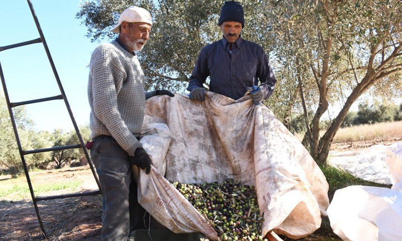 Farmers load harvested olives into a box in the suburbs of Marrakech, Morocco, on Nov. 28, 2020. Olive is a key commodity in daily life in Morocco. (Photo by Chadi/Xinhua)