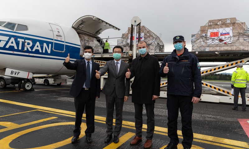 Airport staff members unload Chinese medical supplies in Ljubljana, Slovenia, May 1, 2020. (Photo: Xinhua)