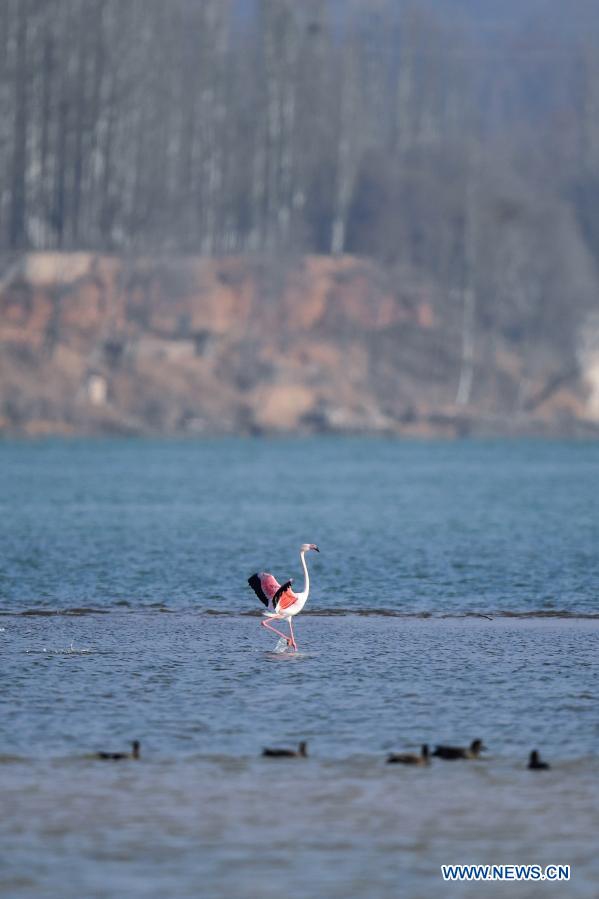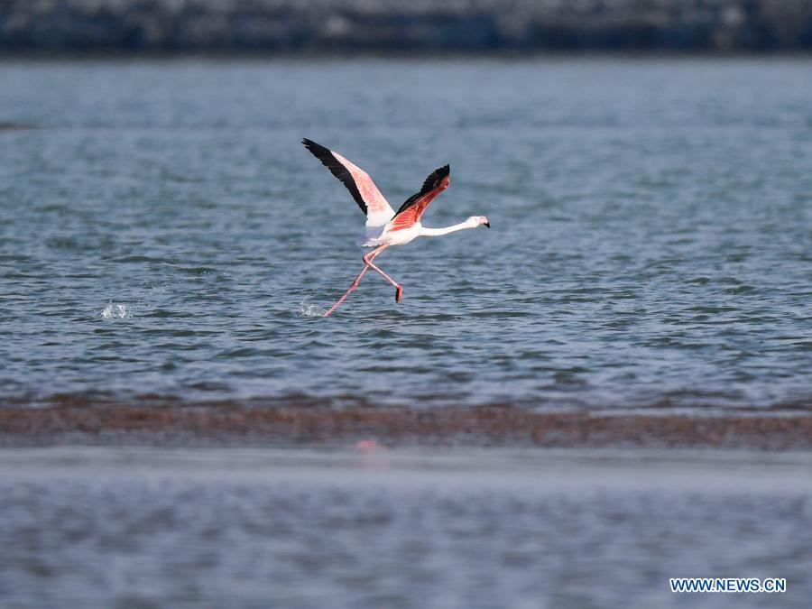 A flamingo takes off from the water near the Yellow River in Hualong Hui Autonomous County of Haidong City, northwest China's Qinghai Province, Dec. 2, 2020. (Xinhua/Zhang Long)