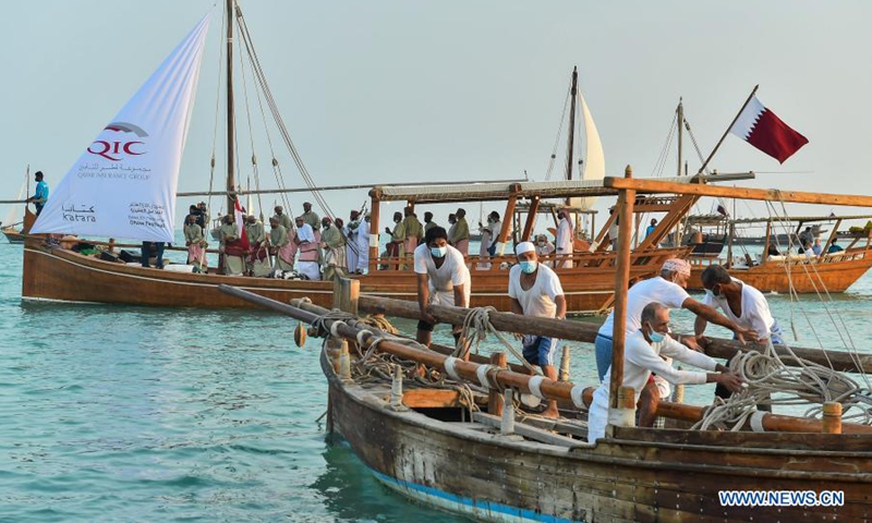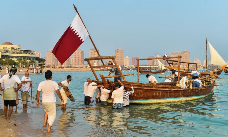 People prepare to launch a dhow into the sea during the 10th Katara Traditional Dhow Festival in Doha, capital of Qatar, Dec. 5, 2020. The festival was held from Dec. 1 to 5 here to showcase maritime traditions. (Photo by Nikku/Xinhua)
