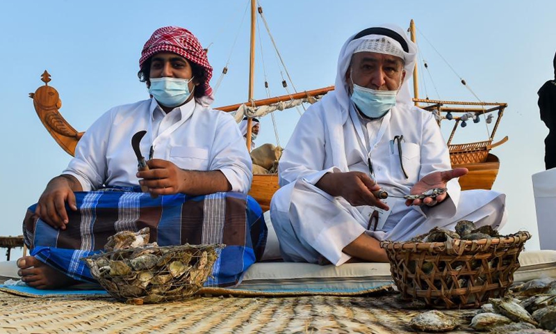 Qatari men open oysters and extract pearls during the 10th Katara Traditional Dhow Festival in Doha, capital of Qatar, Dec. 5, 2020. The festival was held from Dec. 1 to 5 here to showcase maritime traditions. (Photo by Nikku/Xinhua)