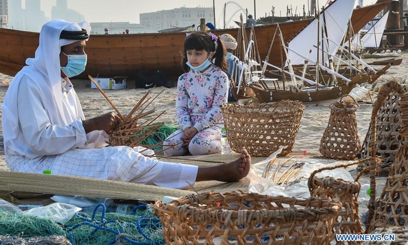 Craftsman make traditional fishing baskets during the 10th Katara Traditional Dhow Festival in Doha, capital of Qatar, Dec. 5, 2020. The festival was held from Dec. 1 to 5 here to showcase maritime traditions. (Photo by Nikku/Xinhua)