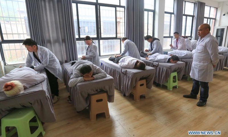 Trainees attend a skill training course at a school for blind persons in Qixingguan District of Bijie City, southwest China's Guizhou Province, Oct. 13, 2020. All 488,000 registered impoverished disabled people in Guizhou had been lifted out of poverty, data from provincial disabled persons' federation showed recently. (Photo: Xinhua)