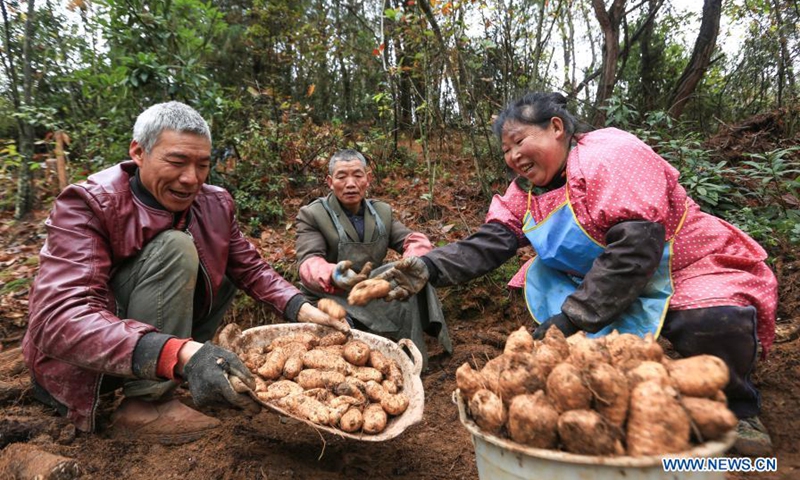 Wu Daoyuan (L), who has a disability in left leg, collects gastrodia elata with villagers at Qixingguan District of Bijie City, southwest China's Guizhou Province, Dec. 3, 2020. All 488,000 registered impoverished disabled people in Guizhou had been lifted out of poverty, data from provincial disabled persons' federation showed recently. (Photo: Xinhua)