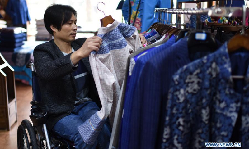 Li Wenrong, who has disabilities in two legs, sews clothes for customers at her own hardware store founded in 2018 with support of local poverty alleviation policies, at a resettlement area for relocated impoverished people in Qianxi County of Bijie City, southwest China's Guizhou Province, Dec. 6, 2020. All 488,000 registered impoverished disabled people in Guizhou had been lifted out of poverty, data from provincial disabled persons' federation showed recently. (Photo: Xinhua)