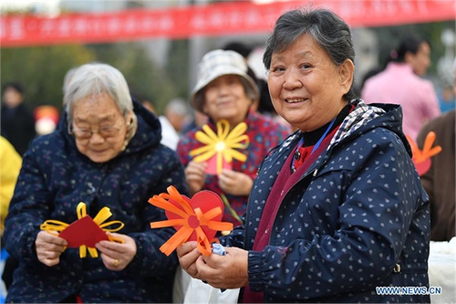 The elderly show the greeting cards they received at a community in Xi'an, northwest China's Shaanxi Province, Oct. 23, 2020. An event to greet the upcoming Senior's Day, also known as the Double Ninth Festival or the Chongyang Festival, was held in the community. (Xinhua/Zhang Bowen)