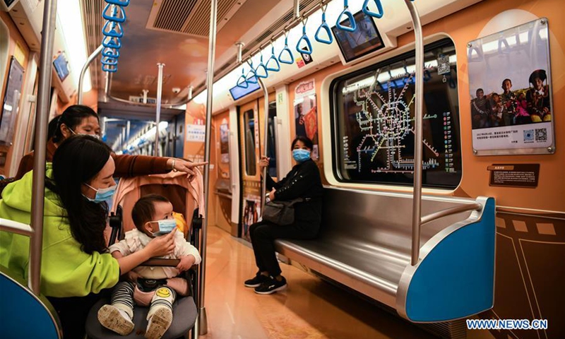 Passengers take a poverty-alleviation-themed train of the Line 1 of Chengdu Metro in Chengdu, southwest China's Sichuan Province, Oct. 17, 2020.