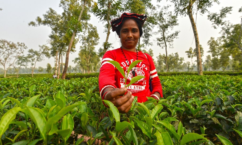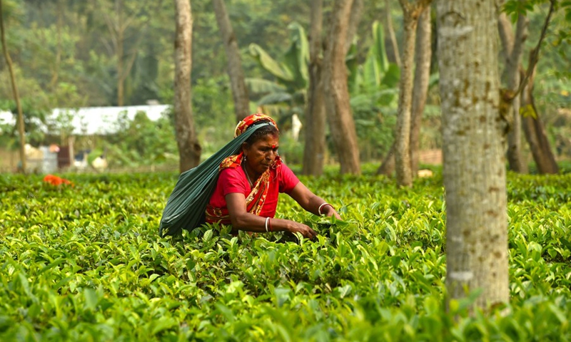 A woman picks tea leaves at a garden in Sreemangal, Bangladesh, Dec. 7, 2020.(Photo: Xinhua)
