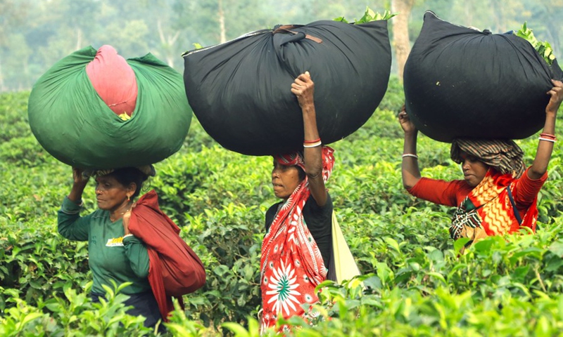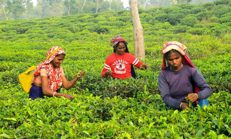 Women pick tea leaves at a garden in Sreemangal, Bangladesh, Dec. 7, 2020.(Photo: Xinhua)